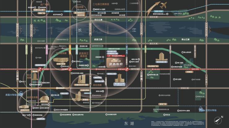余家头站(地铁5&10号线交汇)直线距离约150米和平大道、临江大道拉通武昌滨江商务区,串联武昌中心