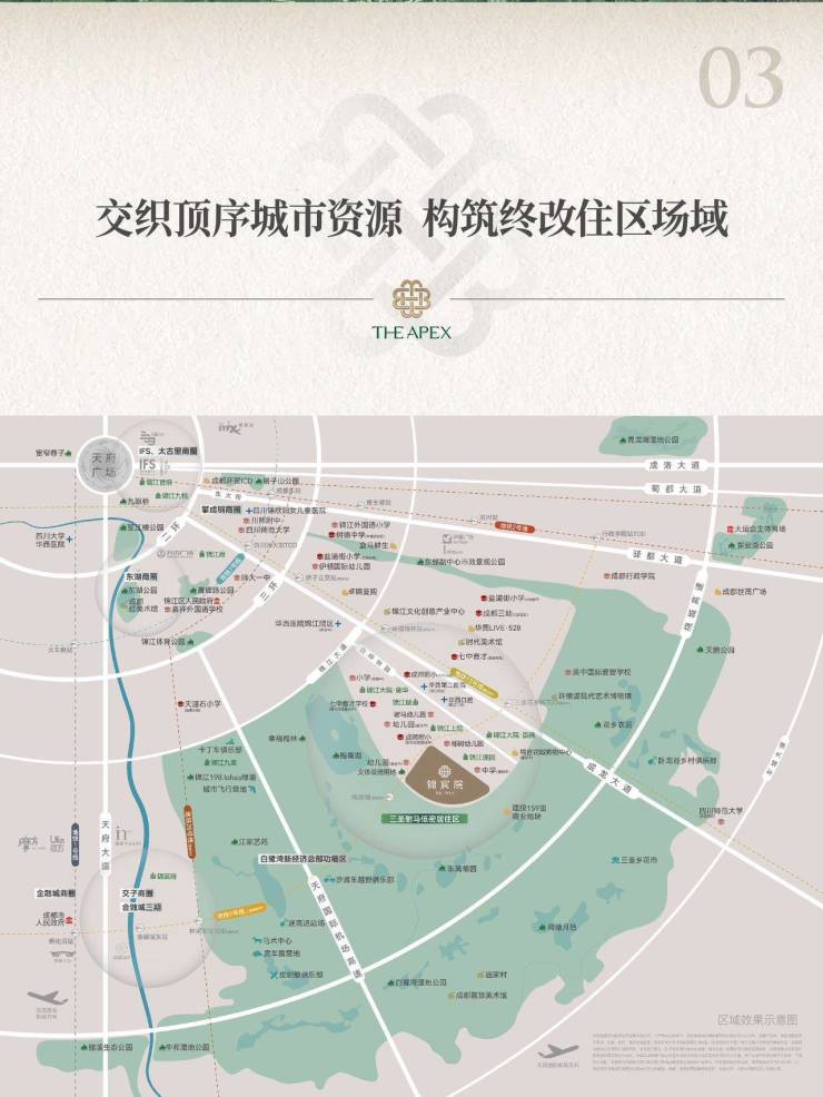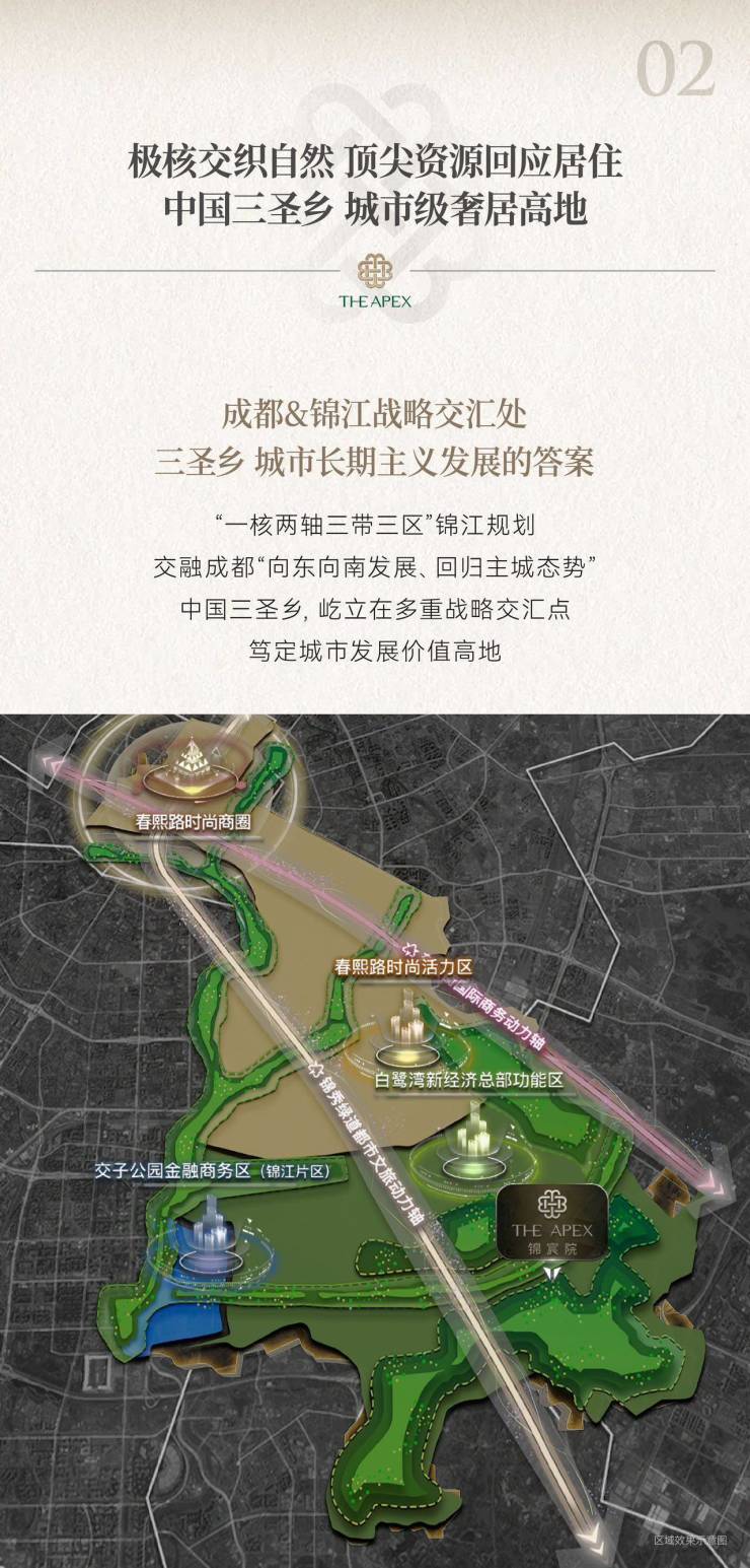 锦宸院雄踞锦江区三圣乡驸马半岛核心,扼守主城向南发展主轴,是锦江主城罕见的低密高端宜居板块,上承东大街、金融城繁华,下启白鹭湾新经济活力,兼得主城核心价值与原生生态资源。项目总占地约126 亩,一期约 78 亩,整体容积率低至1.8,规划纯洋房、叠拼两大产品形态,仅 405 户纯粹圈层,无高层高密度业态,是主城难得一见的低密奢居大盘。