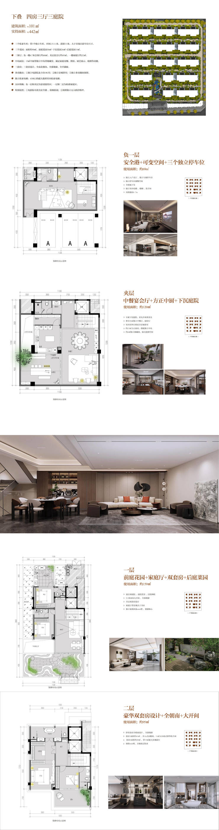 产权面积约101㎡,实际使用面积442㎡,配备3个独立车位,花园总面积约90㎡(50㎡前院+26㎡下沉庭院+15㎡后院)