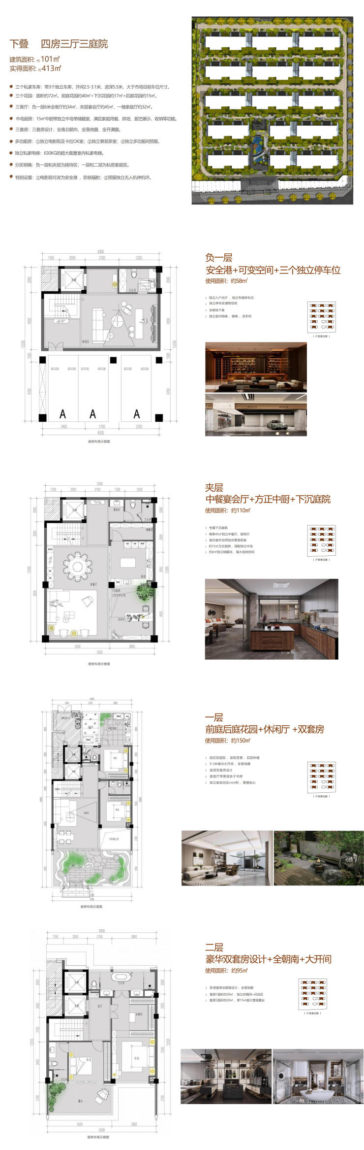 产权面积约101㎡,实际使用面积413㎡,配备3个独立车位,花园总面积约72㎡(40㎡前院+17㎡下沉庭院+15㎡后院)