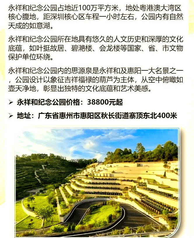 永祥和人文纪念园成立于2019年的现代化陵园,位于粤港澳大湾区的核心地带,与深圳仅一山之隔。作为广东省民政厅批准的永久性墓园,它坐落在惠阳区秋长街道,占地面积达1200亩。周围的山林川谷面积超过30平方公里,地理位置十分优越。