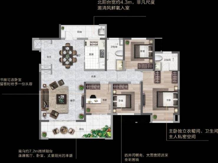 私密性佳户型四面宽朝南,南北双阳台,通风效果好;餐厨一体,客厅与阳台、餐厅相连,空间感大;主卧与另外两次卧完全分开。