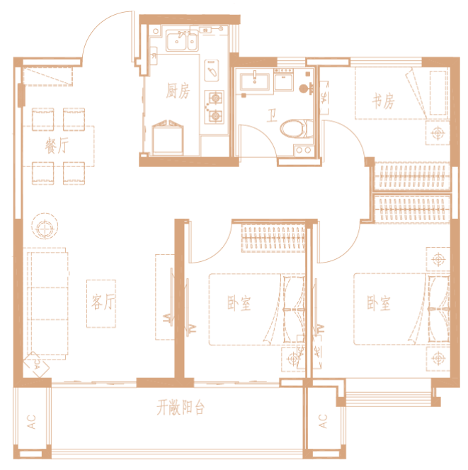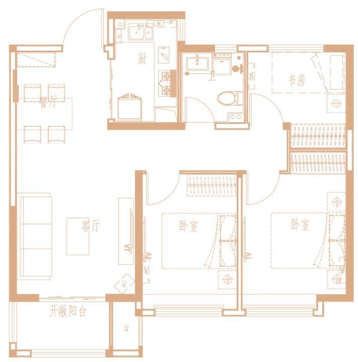 89㎡温馨三房:【三开间朝南、南北通透、180度全明采光+独立书房】