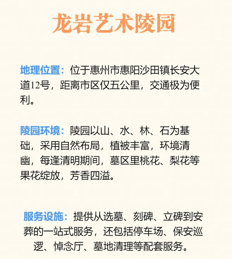 惠州龙岩艺术陵园简介惠州龙岩艺术陵园位于广东省惠州市惠阳区沙田镇长安大道12号,占地数百亩,毗邻碧桂园温泉度假村、世外梅园避暑风景区,四周有千亩生态柑桔园。