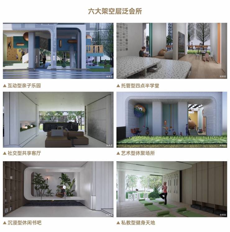 在2#、3#楼架空层配置高标准泛会所,通过互动型亲子乐园、托管型四点半学堂、社交型共享客厅、艺术型休聚场所、沉浸型休闲书吧、私教型健身天地等6大生活场景营造,让每位业主家人都能找到属于自己的社交互动圈子。
