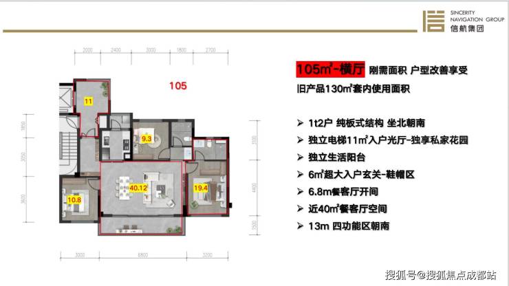 105m²套三双卫 横厅设计,大三房得房率107%,套内实得面积约113m²,媲美市场其他产品130m²左右套内实得面积