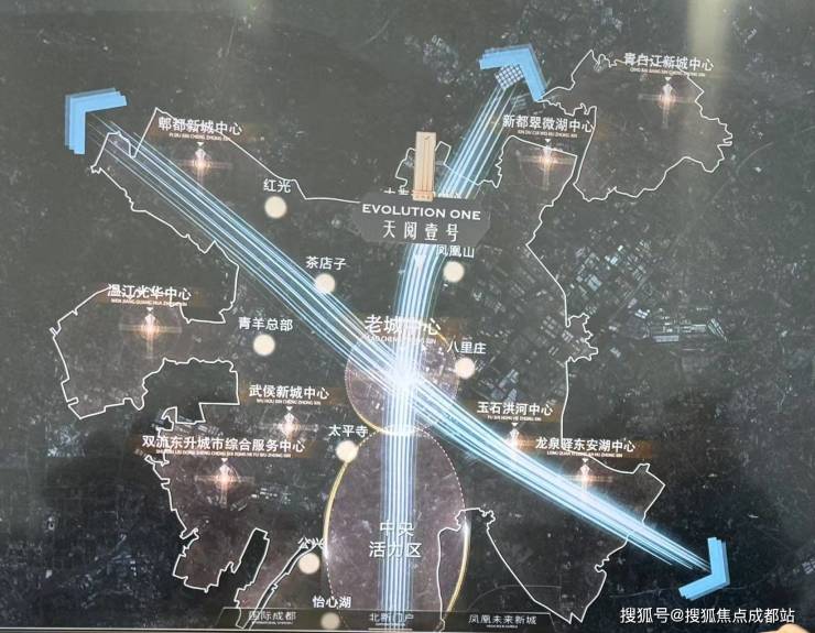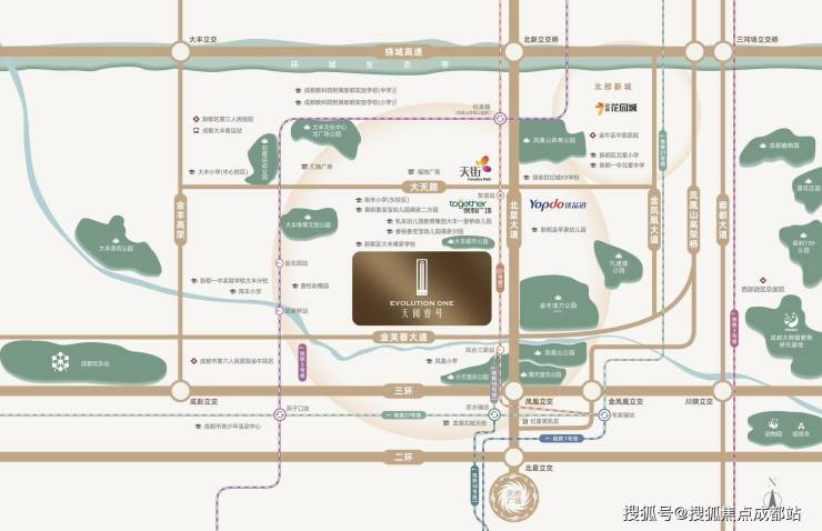 1:成都北中轴三环边,以天府广场为中心对折城南金融城,凤凰新城桥头堡