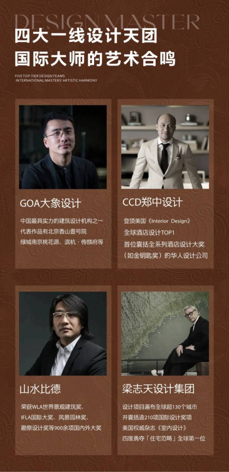 联袂GOA大象设计、CCD郑中设计、梁志天设计、山水比德、MOA灯光设计五大全球顶奢设计天团,以国际视野雕琢东方隐奢传世之作,每一处细节皆为顶豪标准。