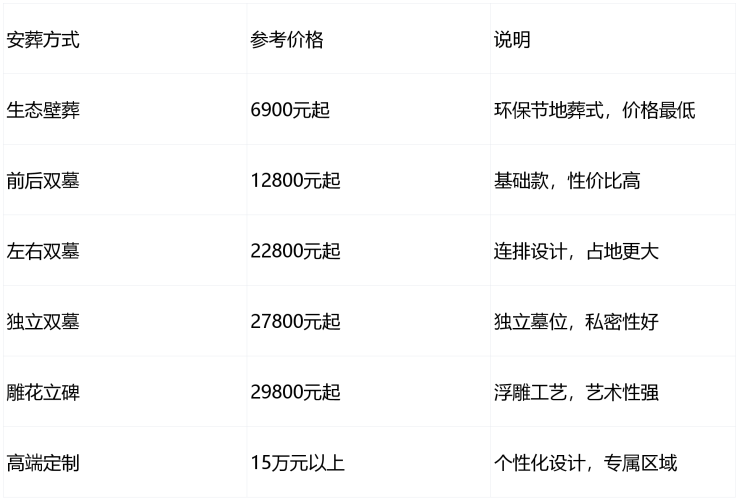 价格说明:以上价格仅供参考,实际成交价受墓型、苑区、位置、朝向、石材与工艺等因素影响,请以园区当日公示与合同价为准。管理费约120-140元/年。