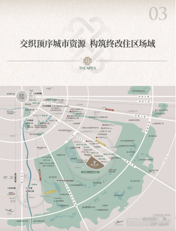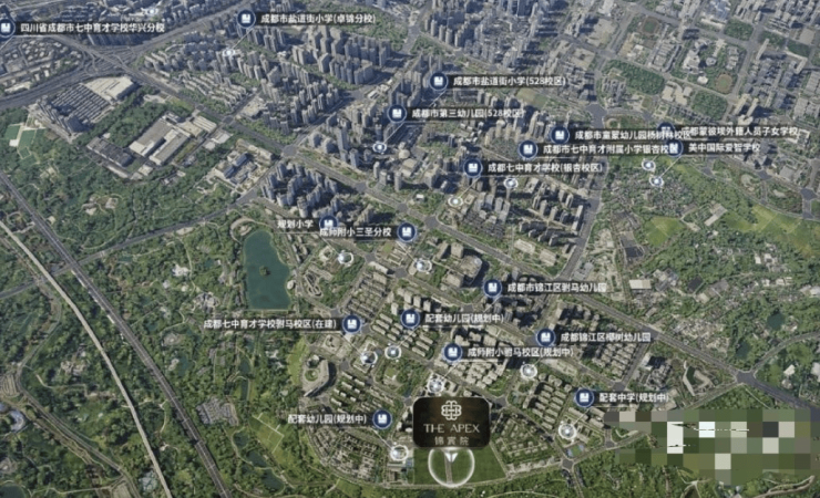 2所七中育才系、2所成师附小系;4所国际学校、7所幼儿园等近20所学校。许燎源博物馆、蓝顶、何多苓等艺术IP,群落交织顶级人文品格与底蕴,启迪一座城市的未来。