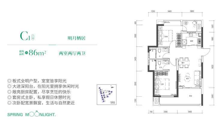 C1户型/ 建筑面积约86㎡ 两室两厅两卫