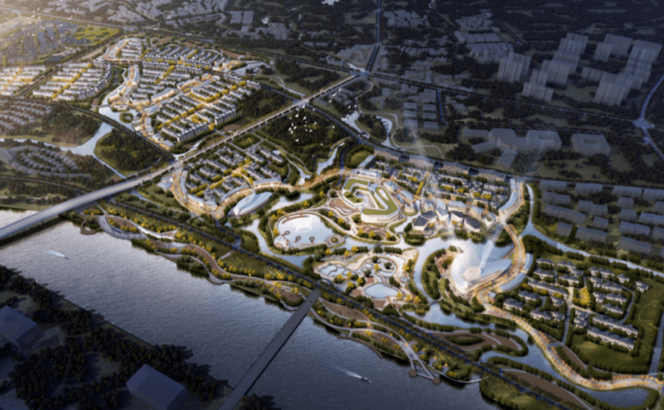 华侨城塑造以水为脉、水绿结合的公共空间,打造“欢乐带”为主题的生态走廊,结合安仁独特的滨水环境,建设有湖心岛、水上乐园、博物馆岛、温泉度假酒店、滨水绿地、带状公园等,开放布局,增益小镇怡然风情。