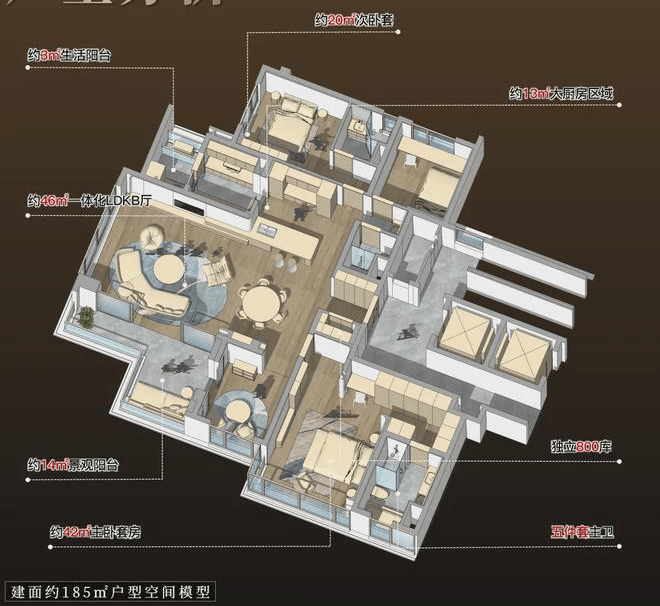 作为整盘排面的185㎡户型是天悦云萃173㎡全景舱户型的另一种演绎。