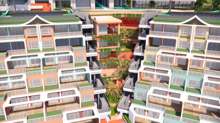 凯莱·阅蓝江,将版纳的色彩与圣托里尼的色彩融入到项目之中,通过高差变化,形成更多元的沉浸式色彩假日场景,并利用垂直电梯连接不同层面的山林视野和归家路径。这样,每次回家都会有不一样的风景作伴,能体验到更多的归家惊喜。