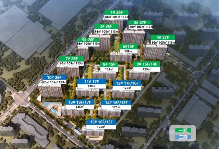 总楼栋:共15栋 ,由7栋26-27层大高层、8栋14-18层小高层组成