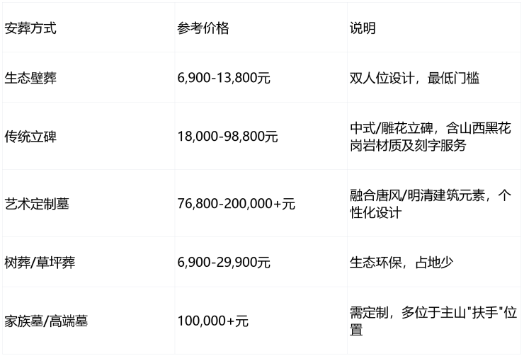 :以上价格仅供参考,实际成交价受墓位位置、碑型、面积及服务类型影响,具体需以现场咨询为准。生态葬占比约40%,性价比优势明显。