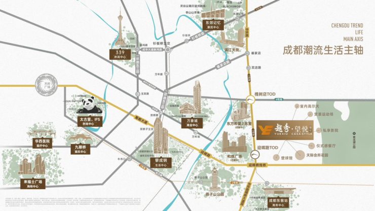 1、蜀都大道-城市壕宅走廊:以天府广场为中心点,向西串联着少城、浣花溪、金沙三大官邸壕宅的基因,每一座影响成都三千年的地标壕宅皆出自于此,向东一脉传承,串联现代成都壕宅城市地标-太古里/东大路的D10、仁恒滨河湾、迎晖天玺。