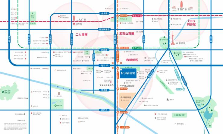 南三环与紫荆山南路中轴,北接紫荆山芯,西邻二七,东近滨河新城,南拓航空港区,聚焦交通枢纽、商业旗舰、醇熟社区,构筑主城繁华