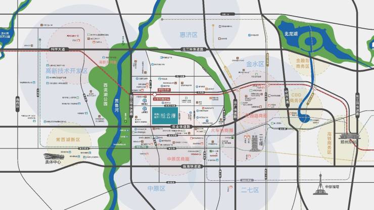 “三园一河”生态大境,西流湖公园、雕塑公园、绿谷公园、贾鲁河萦绕,近享约2933亩湖畔公园及约480亩水域,自然围合,繁华之中享静谧。