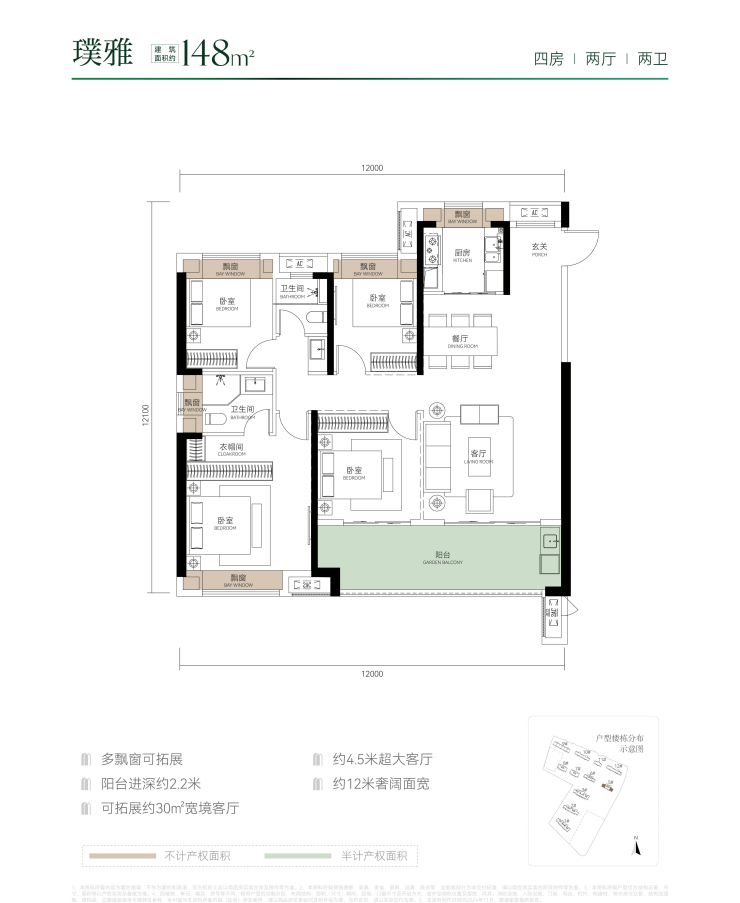 洋房10-14层,面积段138-150-172,得房率90%-94%,层高3.15米