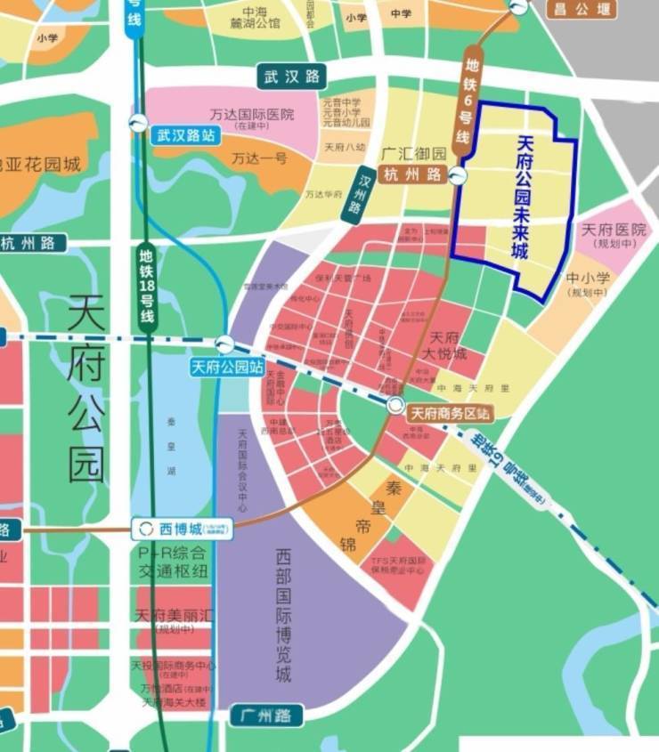 交通上,区域内部覆盖了6条地铁(1、6、16、18、19、26号线),1、6、18、19号线已开通,16、26号线则是作为远期规划中的线路。从地铁分布的密集程度来看,可以看出政府对片区的重视程度,也可以看出这里是目前成都交通通达度最高,出行最便捷的地方。而天府公园未来城就位于地铁6号线和19号线交汇的天府商务区站,属于双地铁上盖,出行更是便利。