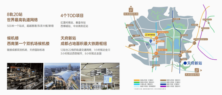 天府中芯——世界领先的综合交通中心中芯城市航站楼——西南地区首座双机场航站楼,每年有超过2000万人从这里出发。轨道交通——8条线路、20个站点、4个TOD,超越了香港、东京大板和新宿,成为世界上最发达的轨道网络之一,使得成都境内外超过2000万人口能够轻松抵达。天府新站——设有12台车厢、22条线路,实现了1小时抵达全川,3小时抵达西部城市,以及8小时抵达全国的目标。