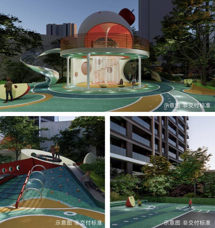 以迪士尼想象学校为灵感,打造分龄段童趣秘境,成就孩子专属游乐园地——牛顿苹果乐园,增加力学实验、登高游乐、光谱乐园等主题空间,宜居、宜游、宜玩、宜学、宜乐。
