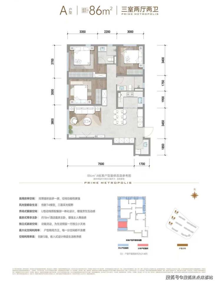 86㎡(2T4户,得房率约30%)
