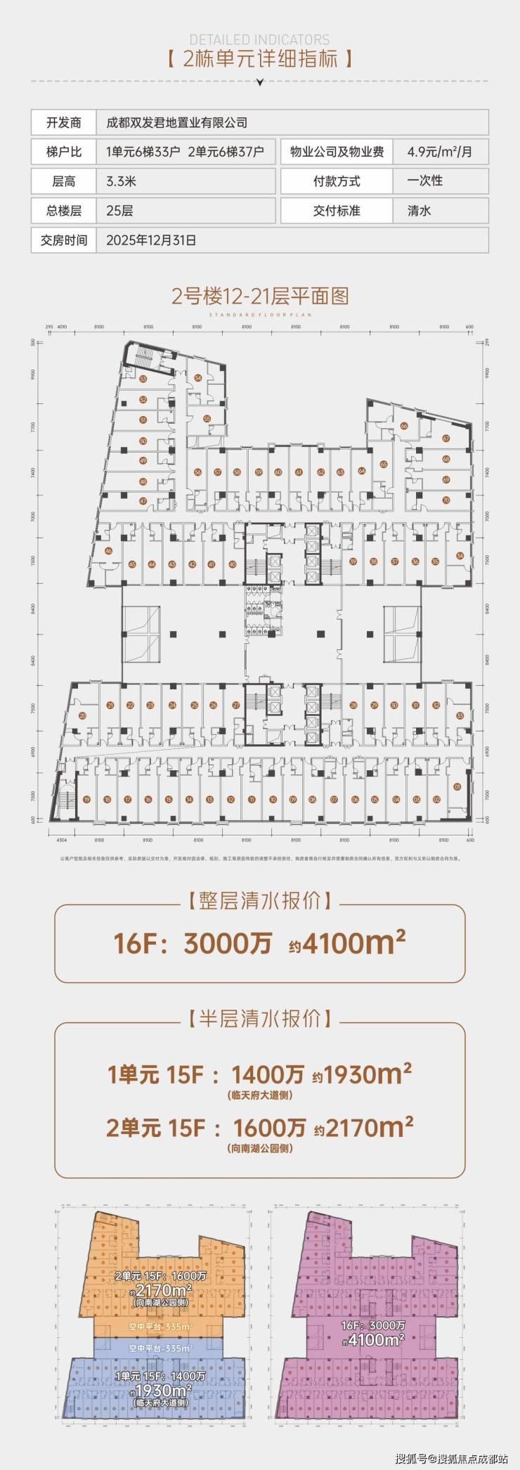 半层报价:1单元15F 1400万 约1930㎡;2单元15F 1600万 约2170㎡