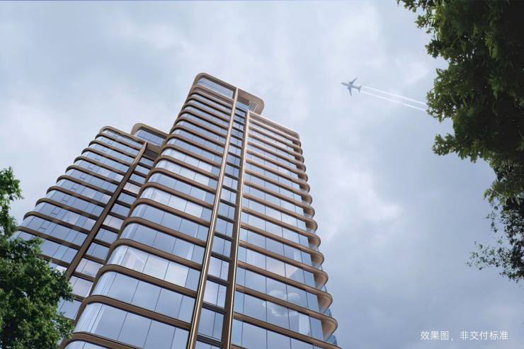 弧形香槟金铝板立面、大面积 LOW-E 玻璃幕墙、精致线条肌理