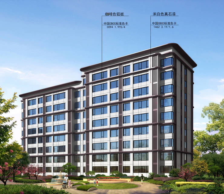 【外立面】:Low-E中空三层玻璃、咖啡色铝板、米白色真石漆、70系列断桥铝合金窗户
