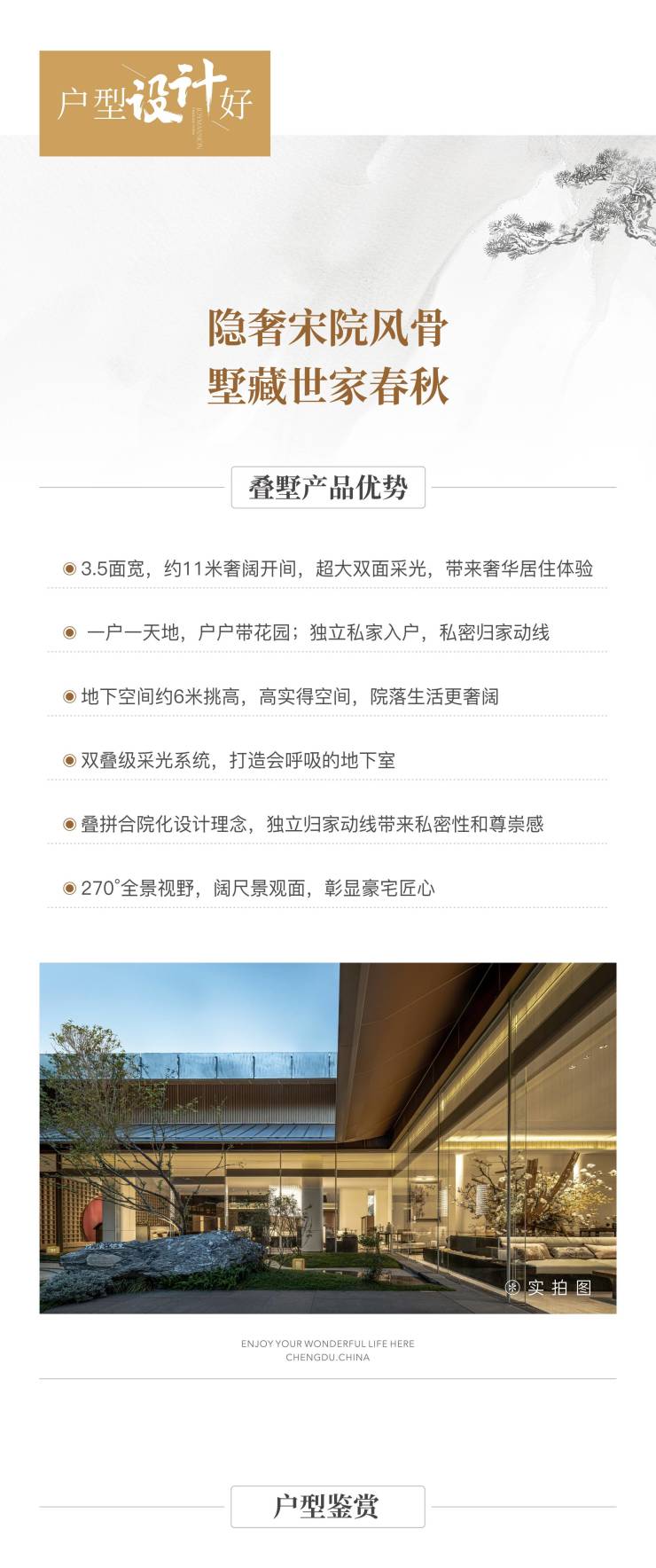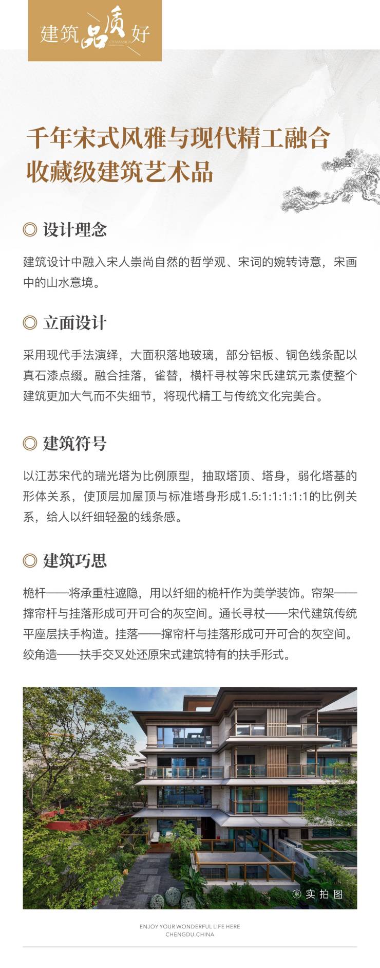 社区建筑以盛世宋风美学 + 公建化质感立面为核心,线条简约雅致、质感高级内敛。内部匠造银杏主题园林、宋式下沉会所、四重归家动线、全龄休闲空间、中央景观轴等多元场景,融合东方意境与现代精奢,营造出则繁华入则静谧、四季有景、诗意栖居的沉浸式居住体验。项目以主城中环绝版地段 + 1.5 超低密 + 百亩纯墅大盘 + 准现房呈现,重新定义主城低密墅居新标杆。
