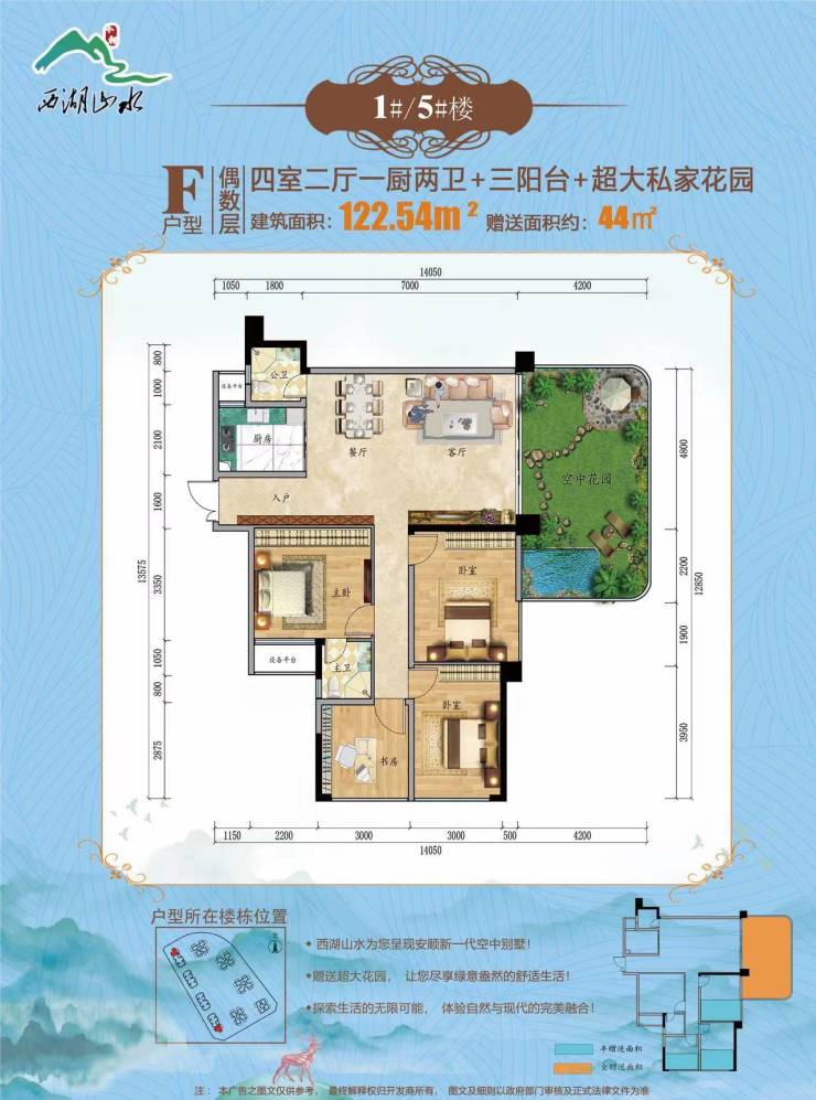 项 目 占地面积约50 亩 ,共由9 栋 18 层洋楼组成 ,均为第四代户型建筑,户型面积从 62 平精致两房到139 平豪华复式 ,也是安顺唯一房屋套内面积再做赠送的小区。西湖山水项目容积率 2.5,绿化率35%,小区配套儿童游乐场、健身休闲区6000 平中庭打造优质高端生活园林小区 ,带您尊享生活的诗篇 ,与自然同频的美好。由政府倾力打造的花山绿道蜿蜒西湖山水而过 ,作为安顺唯一铁路主题山体生态公园 ,小区道路直通绿道 ,花山绿道也将成为您茶余饭后的又一去处。三、在售户型鉴赏