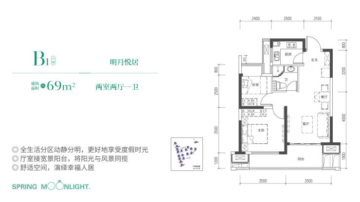 B1户型/ 建筑面积约 69㎡ 两室两厅一卫