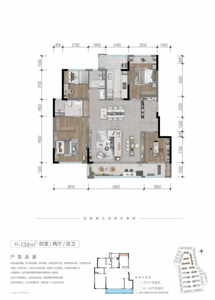 主力户型:建面约 111㎡(套三)、136㎡(套四)。