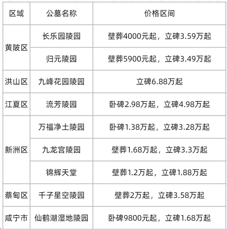 武汉长乐园陵园:位于武汉市黄陂区六指街,双穴立碑起售价35900元。