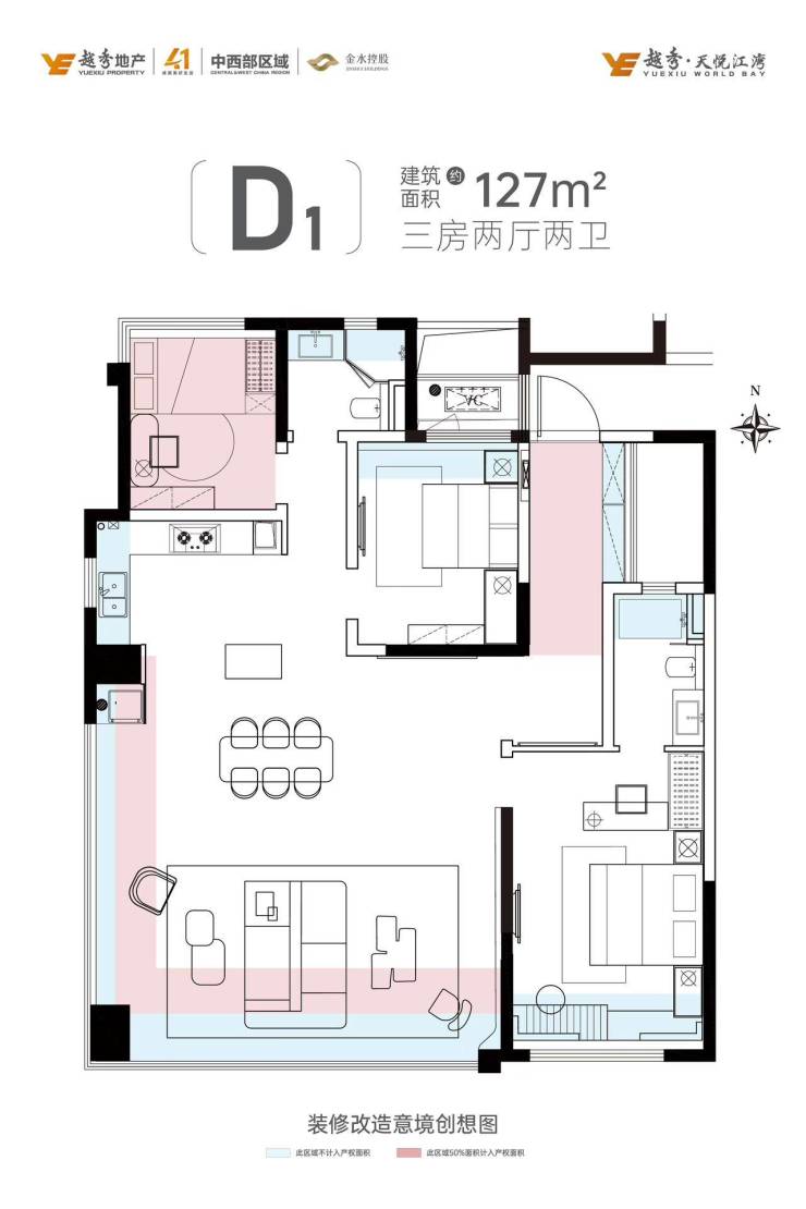 2、郑州首个127㎡户型,做到约99%综合得房率,实现270°环幕式景观阳台。