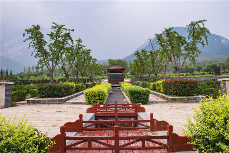 陵园坐落在嵩山少室山脉,绿化覆盖率超过90%,形成了花园、果园、核桃园等多层次生态景观。其“背山面水”的地理格局,符合传统风水学中理想的布局,四季景色宜人,环境清幽 。