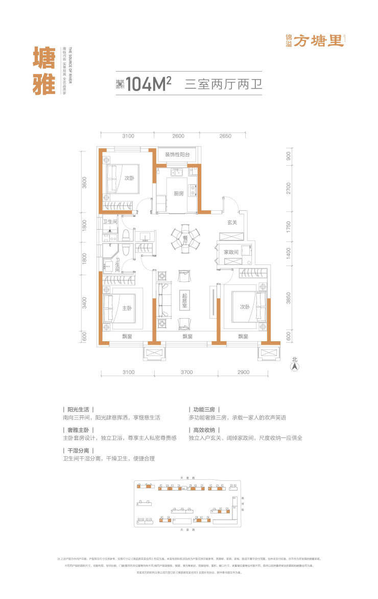 【建面约104㎡ 】 明星三房样板 同等面积功能更优!南向三面宽+个性化飘窗空间,采光更好,三室两厅两卫+主卧套房(含卫生间),尊享从容,玄关系统+家政间系统,收纳加倍。