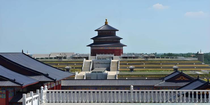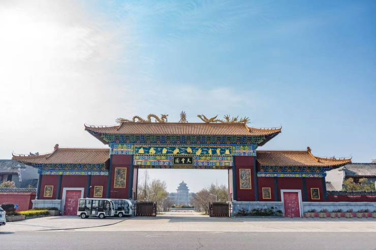 园区内建有19米高的四面观音像(仿三亚南山观音)、唐代风格的祭祀中心(鎏金宝顶、蓝瓦红柱),以及“祈福坛”“九州殿”等中式园林景观,融合传统祭祀与现代美学。