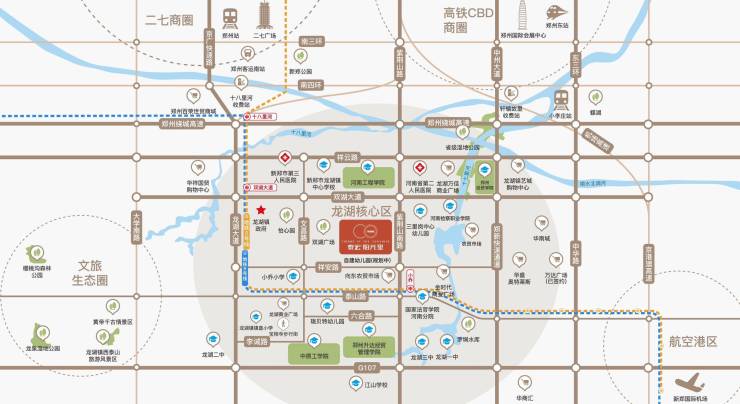 城市路轨,卓越出行品质项目周边路网丰富,包括紫荆山南路、郑新快速路-中州大道、龙湖大道、中华路-东三环等四纵主干;绕城高速、祥云路高架、双湖大道、107国道等四横通路,比邻地铁二号线双湖大道站和小乔站双地铁站,距地铁二号线小乔站约450米。