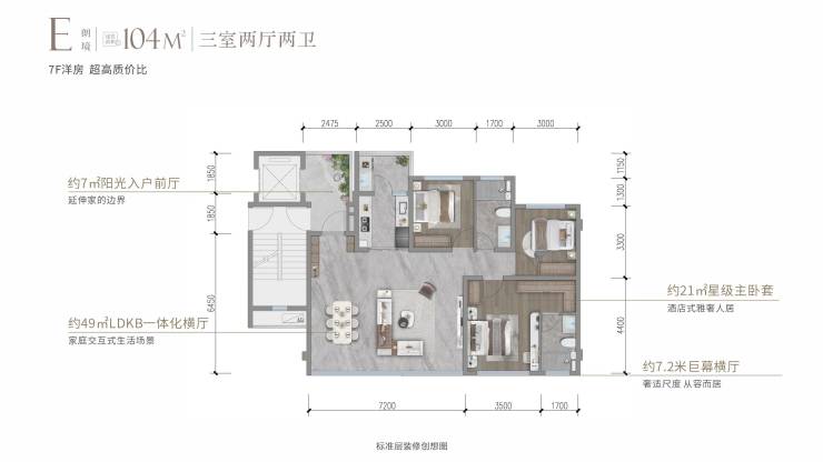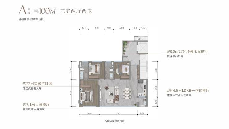 产品亮点:配备 双主卧套房 或独立衣帽间,拥有约7.2米天幕横厅,对标主城400万级豪宅体验。