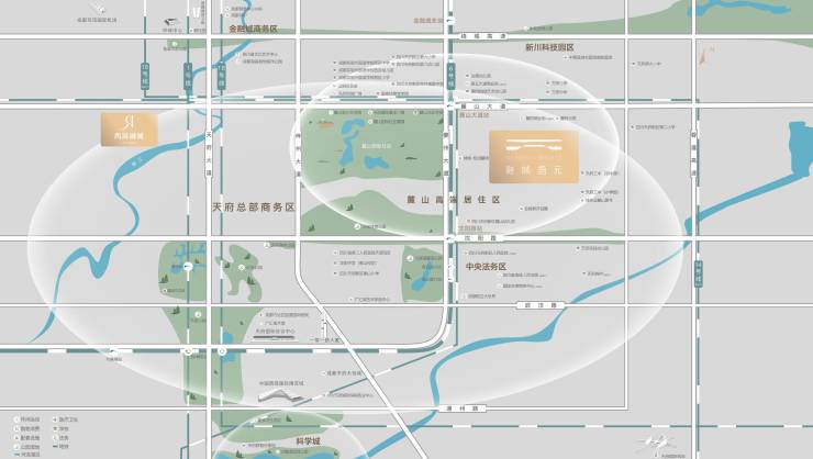 麓山国际生态区(约 2000 亩)、麓湖生态城(约 8300 亩)、天府森林公园、红石公园、万安体育公园