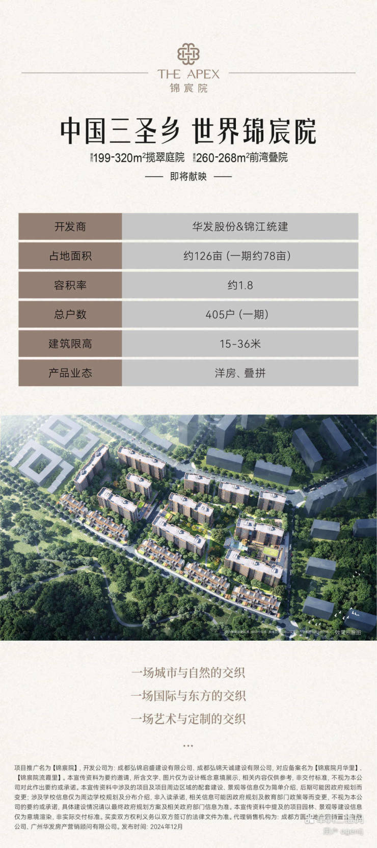 ,规划纯洋房、叠拼两大产品形态,仅 405 户纯粹圈层,无高层高密度业态,是主城难得一见的低密奢居大盘。