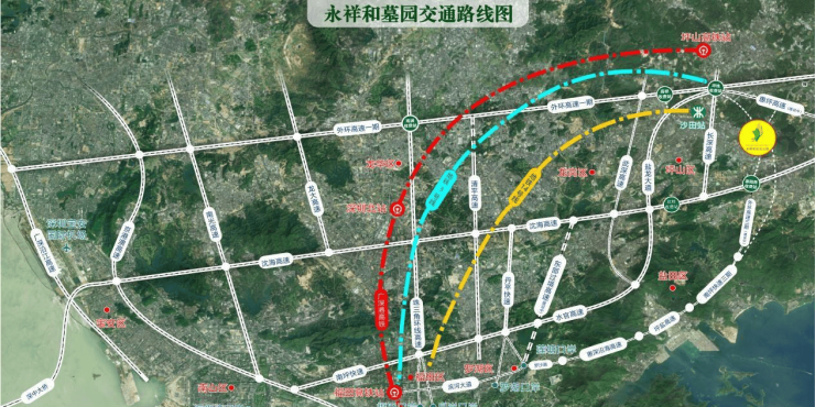【永祥和墓园】地处粤港澳大湾区核心腹地,与深圳一山之隔,占地近100万平方米,深圳外环高速、沈海高速、南坪快速等均可快速到达,距深圳核心区车程一小时左右,毗邻深圳地铁14号线沙田站,设有免费接驳班车,通过深圳几大口岸无缝接驳港澳,交通四通八达,所在区域属于岭南莲花山脉,背倚莲花山脉主峰,三面环山、一面临水,形成“左青龙、右白虎、前朱雀、后玄武”的天然格局。200亩自然水域贯穿园区,搭配松山、花海、禅溪等景观,四季景致各异,以“净”作为核心规划设计理念,提供包括树葬、花葬、草坪葬等环保形式,价格亲民
