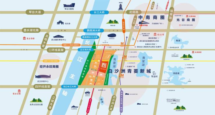 项目占据青菱新城中芯地段,远离三环四环的尘嚣,“两横三纵四轨交通体系”西有青菱大道,新武金堤路,东有青菱湖西路,5号17号30号32号线贯穿全城。地理优势∶占据白沙洲中段有利地形,享受繁华特色。
