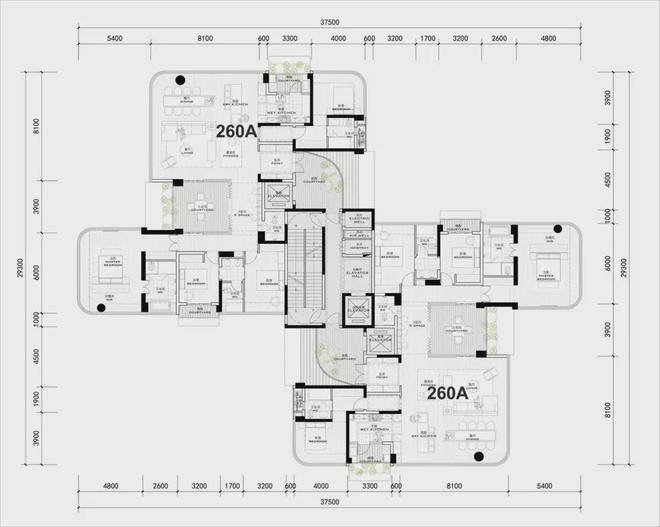 6种户型,得房率在94%上下——260平户型标准层3梯2户,私梯入户。