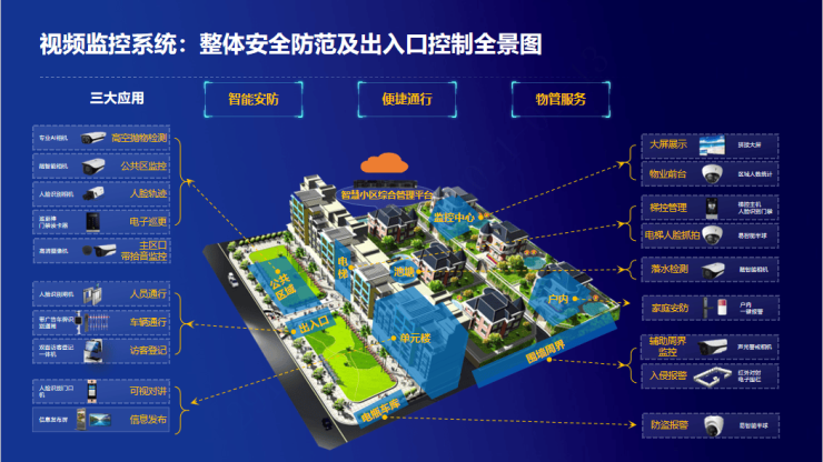 智能安防组成:视频安防监控、周界报警、可视对讲系统、电子巡更、出入口管理、停车管理