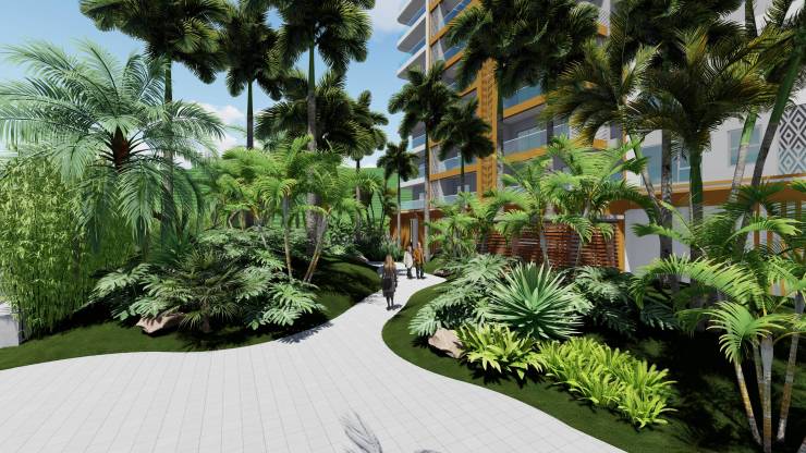 坡地优势,结合版纳文化,呈现孔雀振翅、舞动的美好画面,地域特色与现代感相得益彰