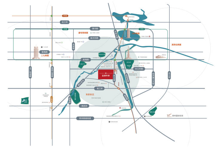 黄金围合区域,中州大道、南三环、机场高速、航海路等多条交通干道环伺